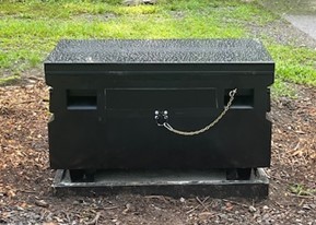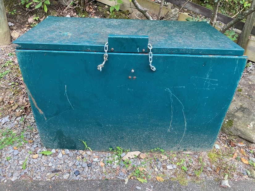 Bill Roberts had a similar problem with bear incursions with his trash box. His solution was to purchase a new job box at Lowes/Home Depot like many others have done. But Bill painted his box then secured it to a concrete pad with bolts through each of the four feet. He also used a chain bolt snap to secure the lid closed. And like the Broughs, so far so good! And it’s good looking as well.