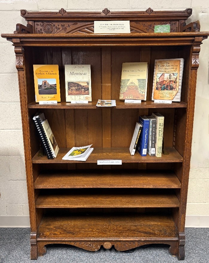 Pictured is Mary Martin’s bookcase, donated to the PHC in 2012 by Betty Mawell, which displays the current selections for the PHC Book Club.