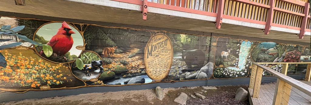 The new boardwalk parallels the foundation of the Bell Building, one of three buildings making up the Raspberry Center. MRA staff recognized that it would be a perfect location for a Montreat-themed wall mural. Martha Sloan, MRA Director of Donor Engagement, identified an Asheville based mural and sign painter, Scott Allred, owner of Brushcan Mural and Sign. Martha and Scott began talking about the mural’s theme and it developed quickly. The inspiration was Montreat’s “flora and fauna”. Martha gave Scott ideas for the subjects and Scott began researching images to paint. The result is an 80’ long by 8’ high mural filled with realistic paintings of some of our favorite outdoor living things, including a bear (of course!), Flat Creek, a piebald deer, dogwood trees, azaleas, a pesky squirrel, a brook trout, galax plants, and so much more.